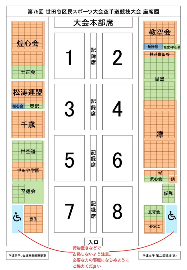 8コート(7m四方)で選手集合場所が確保出来ません。各コート7〜15名程で行い試合展開が早いです。自分が出場する試合の一つ前の種目には非常に狭いですが、コートの横に集合してください。